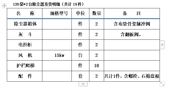 除塵器隨車發(fā)貨清單: